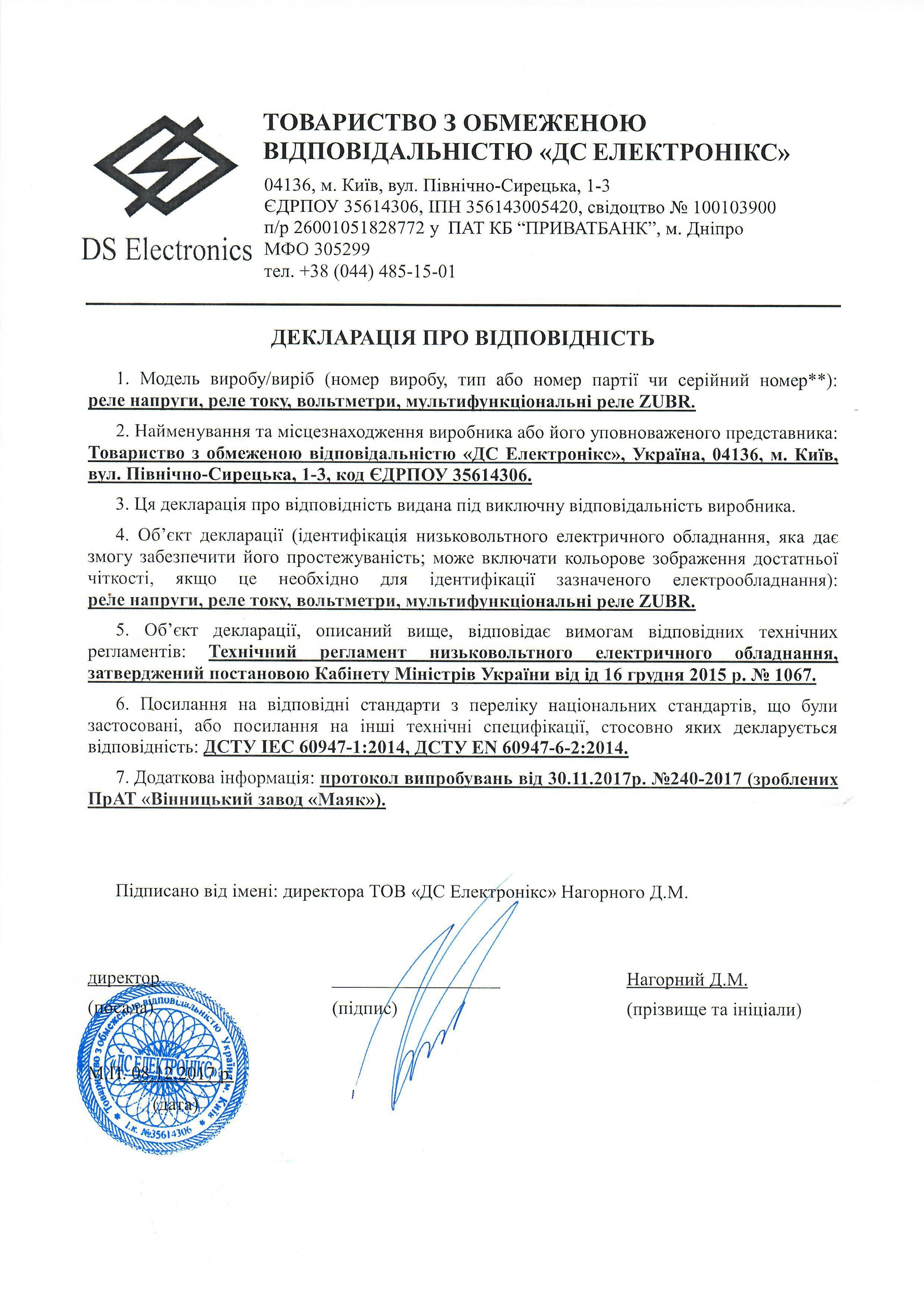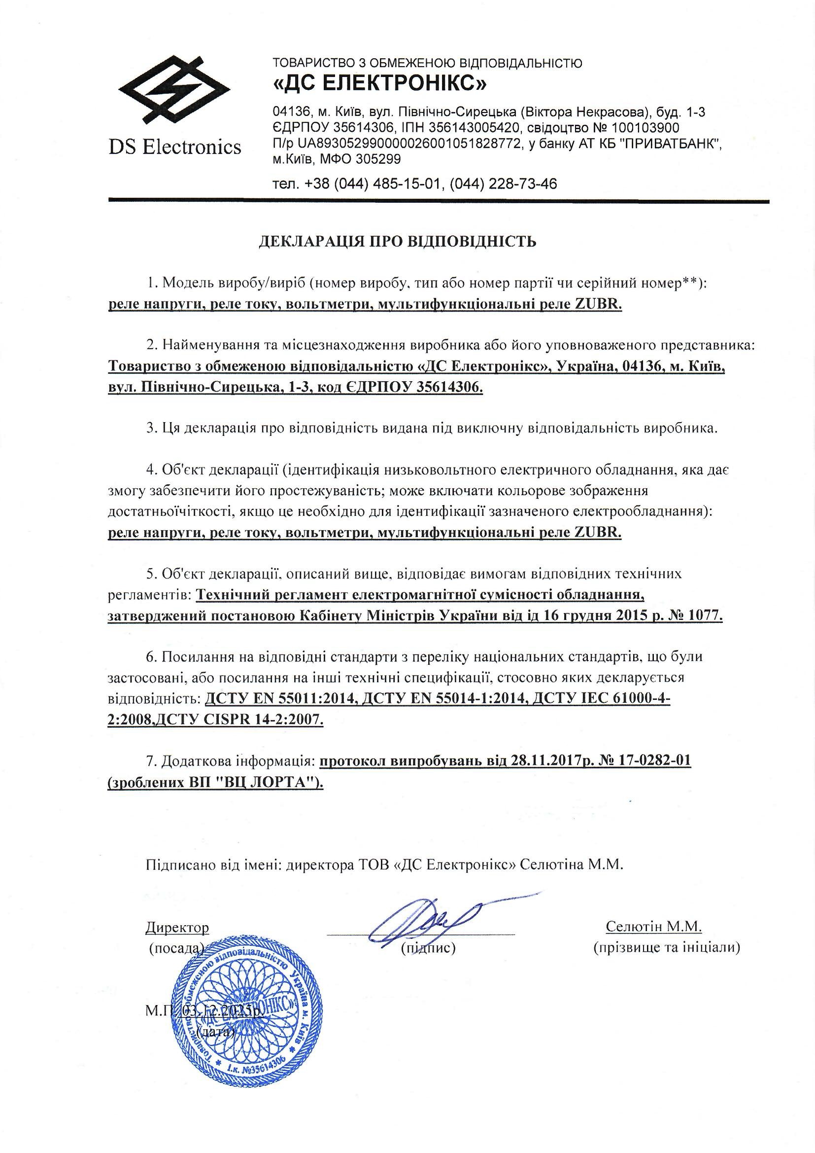 Декларація про відповідність ТР низьковольтного електричного обладнанняЗавантажити у PDF