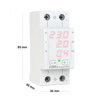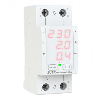 Мультифункціональне реле ZUBR MF2 має компактний корпус шириною 2 модуля. Завдяки трьом цифровим екранам, одночасно відображає значення напруги, струму і потужності, що дуже зручно при контролі всіх параметрів одночасно. У режимі очікування доступна можливість налаштування яскравості екрану. У реле ZUBR MF2 широкий функціонал, який об'єднав в собі: контроль напруги, струму та потужності, а також можливість поглиблених налаштувань.