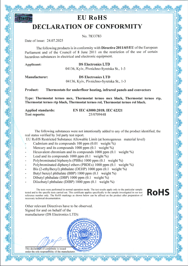 Декларация о соответствии terneo Директиве 2011/65/EUСкачать в PDF