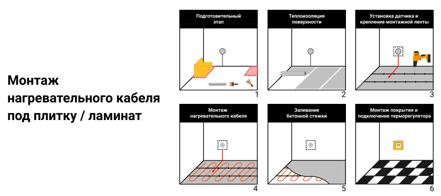 Весь процесс монтажа тёплого пола можно разделить на несколько этапов. Рассмотрим подробнее каждый из них.