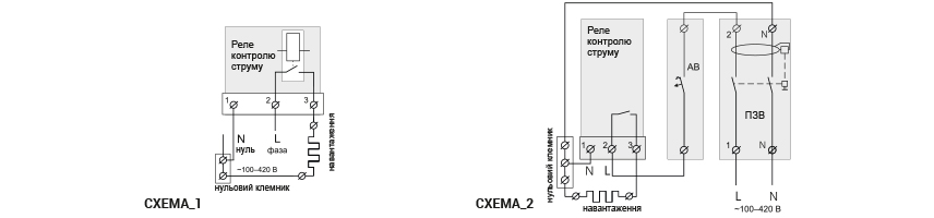 Щоб захистити навантаження від коротких замикань і можливого перевищення потужності в її ланцюгах обов'язково встановіть перед реле автоматичний вимикач (АВ). Його слід підключити в розрив фазного проводу (схема 2). АВ розраховують на номінальний струм навантаження відповідного реле. Людей від ураження струмом витоку захистить пристрій захисного відключення (ПЗВ) (див. cхему 2).