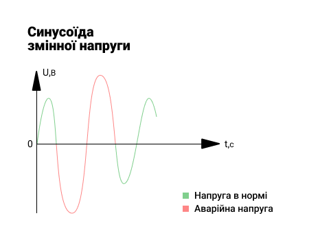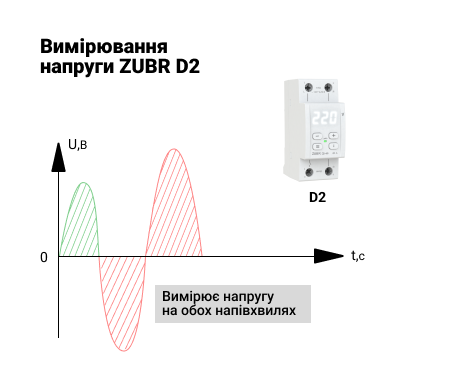 Нагадаємо, що реле напруги ZUBR працює за принципом відсікача і миттєво відключає підключені до мережі електроприлади у разі виходу напруги за встановлені межі. Як видно на малюнку сама синусоїда змінної напруги складається з 2-ух напівхвиль: додатної і від'ємної.