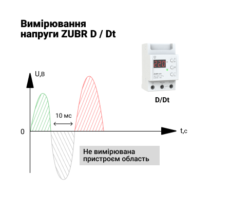 Таким чином, якщо ви використовуєте реле напруги ZUBR D/Dt і момент аварії потрапить в вимірювану область, то реле вимкне електроприлади через 0,01-0,03 сек (час має розкид так як у різних електромеханічних реле в складі ZUBR час спрацьовування може трохи відрізнятися), а ось якщо момент аварії потрапляє в невимірювану область, то ZUBR помітить аварію тільки на наступній півхвилі через 0,01 сек, яка знаходиться в вимірюваній області, і таким чином відключить електроприлади вже через 0,02-0,04 сек.