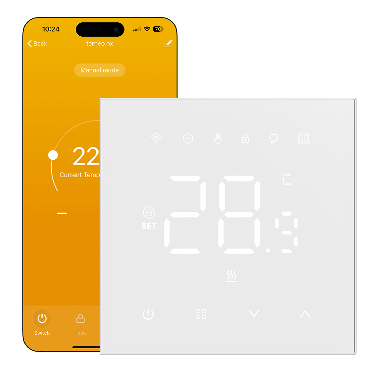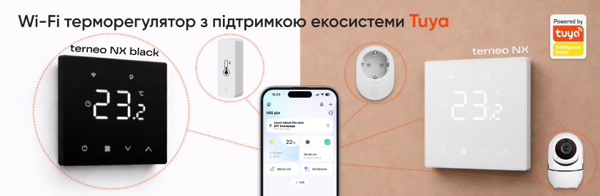 terneo nx — Wi-Fi терморегулятор для керування теплою підлогою зі смартфона через додаток Tuya. Він дозволяє використовувати розумні функції автоматизації, такі як сценарії розумного дому, контролювати температуру, налаштовувати розклад, автоматизувати роботу опалення та оптимізувати споживання електроенергії.